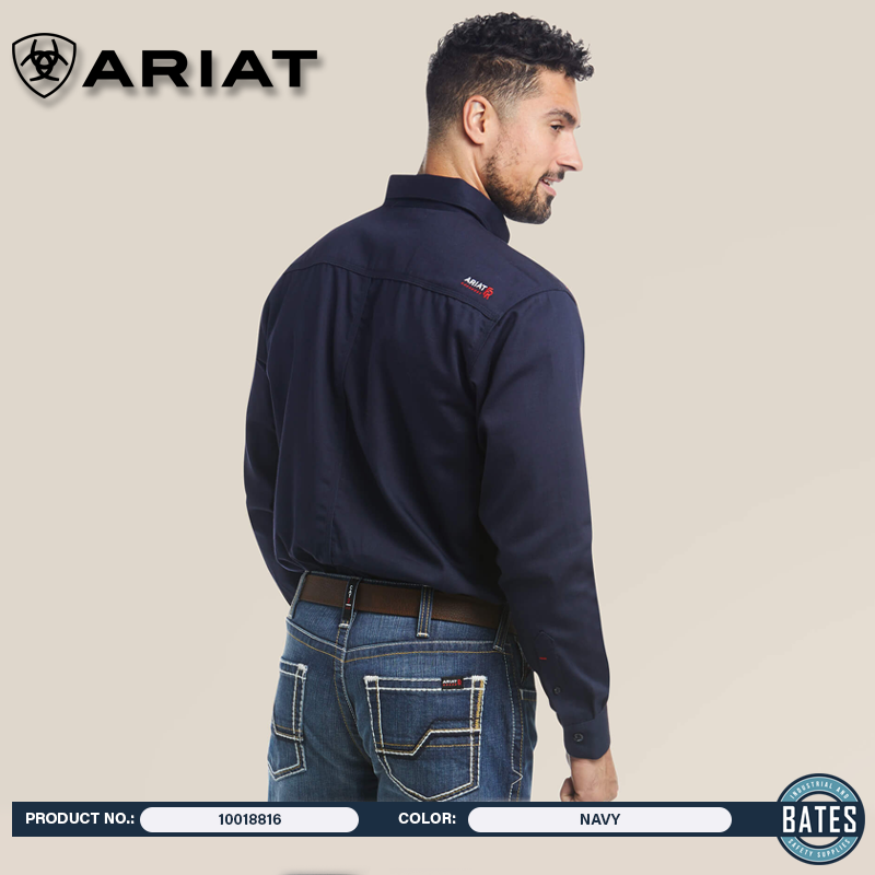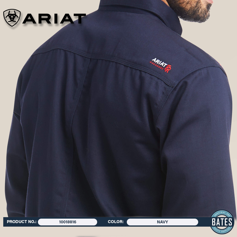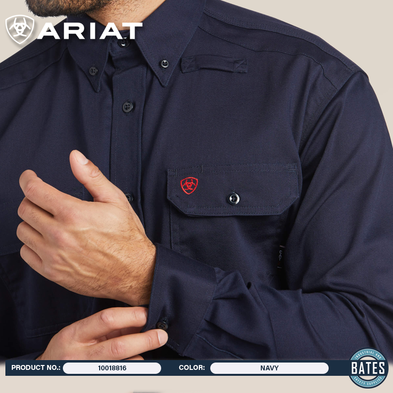 Ariat's FR Button Down work shirts combine a classic fit, quality construction, and fresh patterns for every day of the work week. Built for the office, job site, or even when you’ve called it a day. Button-down with two front chest pockets - the left pocket features a pen slot. Double yoke design and center back seam. [Color: NAVY]