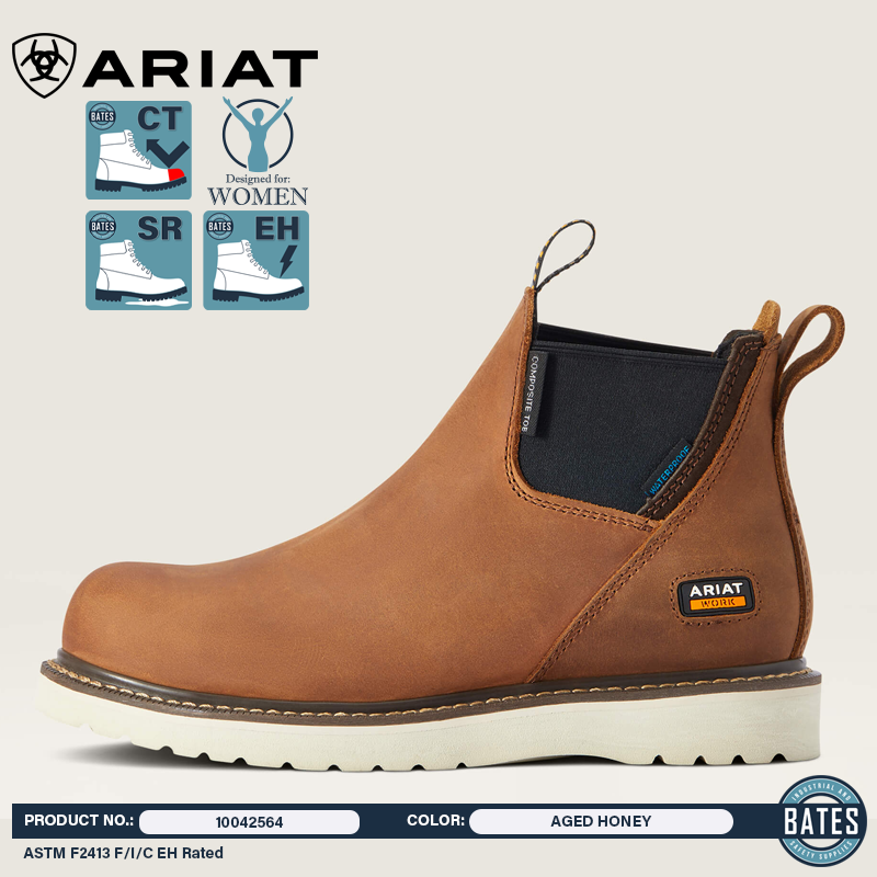 Ariat took their popular Rebar Wedge platform, gave it a composite toe, and styled it after the Chelsea—a classic, close-fitting ankle boot with stretchy elastic side panels. Waterproof construction throughout plus a higher elastic panel placement ensure feet stay dry. [Color: AGED HONEY]