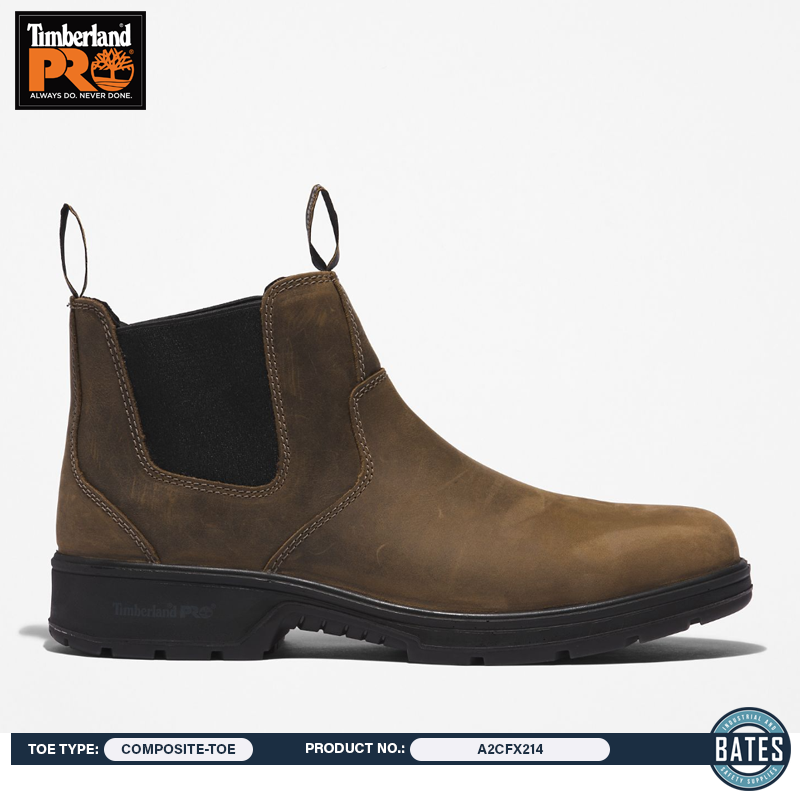 The ease and convenience of a pull-on Chelsea boot meets the performance of a rugged work boot. Enjoy the comfort of Timberland's anti-fatigue technology and lightweight, all-weather outsoles combined with composite safety toes, electrical hazard protection, fiberglass shank support, and direct-inject construction for durability. [Color: TURKISH COFFEE Full Grain Leather].