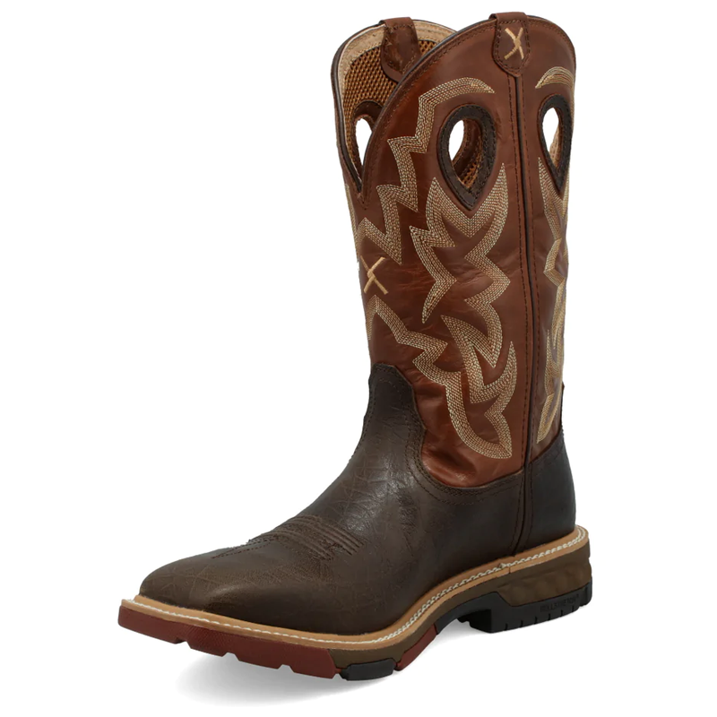 This Men's 12" Waterproof Western Work Boot is a contender for all day comfort. Handcrafted in full-grain leather, features Twisted X® patent-pending CellStretch® comfort technology ensuring that every step you take, is backed by superior comfort. For stability and durability, Twisted X® has combined a combined a compression-molded sugar cane molasses EVA midsole, integrated CellStretch® comfort technology, and a nylon/glass fiber shank. The oil/slip-resistant molded rubber outsole provides durability and improved traction for whatever your day may bring. Twisted X® Work footwear provides all the comfort, stability, and durability that you need to outperform any demanding work environment. [Color: SMOKEY CHOCOLATE/SPICE]